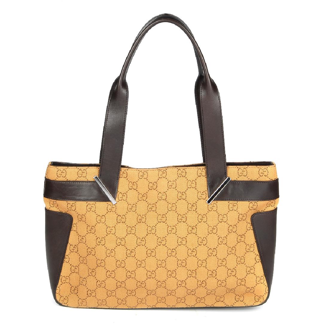 SoldGUCCI BEIGE MONOGRAM COATED CANVAS HANDBAGGucci handbag, in beige monogram coated canvas, with silver-tone hardware, brown leather trim, dual flat handles, open top, tonal woven lining, single zipper and small cell phone pockets, retaining duSee Sold Price