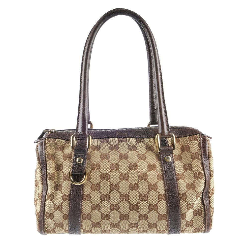 SoldGUCCI - a GG canvas handbag. Featuring a dark brownGUCCI - a GG canvas handbag. Featuring a dark brown canvas exterior with subtle GG monogram pattern and smooth brown leather trim, with polished gold-tone hardware accents to include maker's engravedSee Sold Price