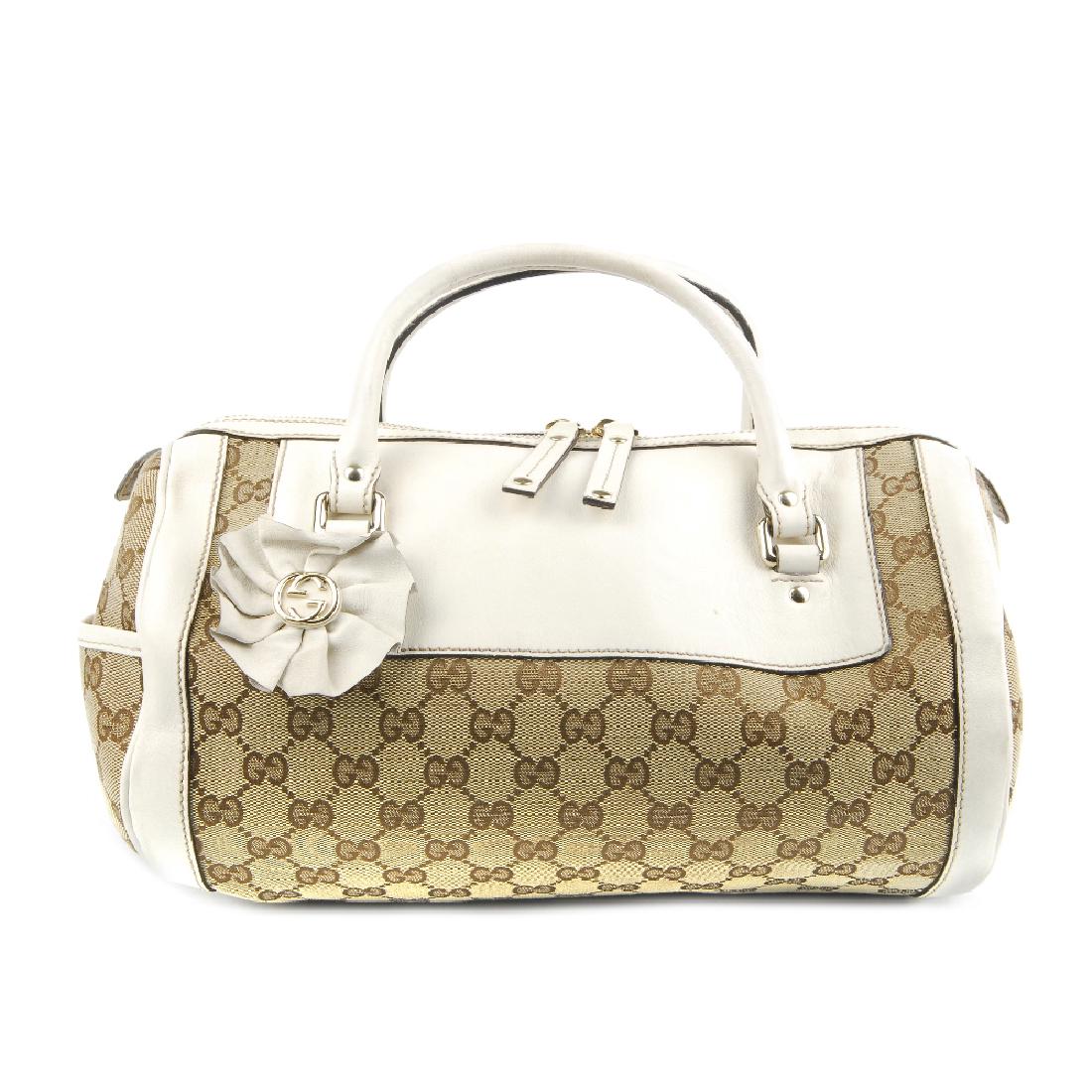 SoldGUCCI - a handbag. Crafted from maker's classic beigeGUCCI - a handbag. Crafted from maker's classic beige monogram canvas with brown leather trim, featuring ruched detail to the front and back, a detachable logo charm, flat leather handle, top zip fastSee Sold Price