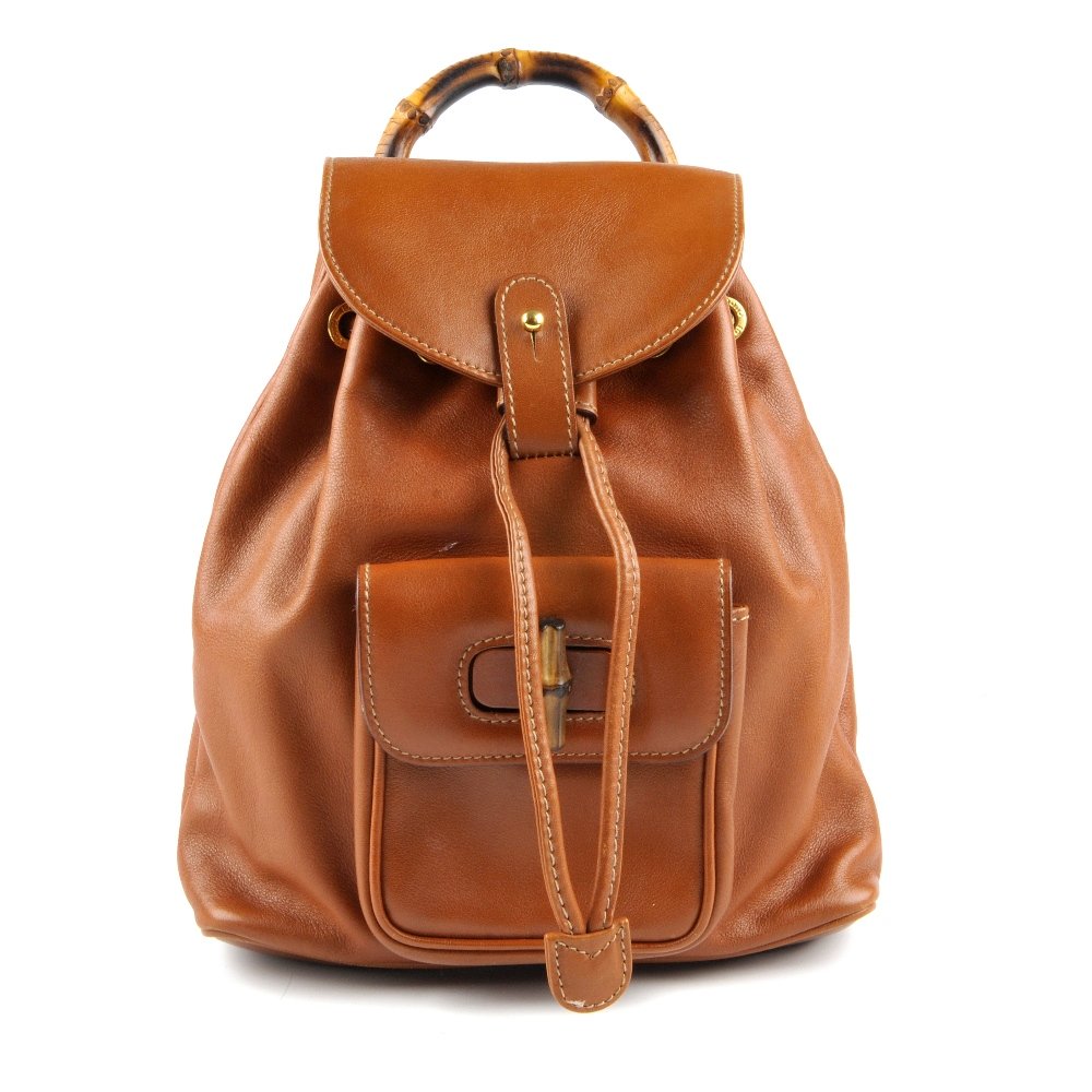 SoldGUCCI BAMBOO HANDLE BROWN LEATHER MINI BACKPACKGucci bamboo backpack, in caramel brown leather, with bamboo top handle, adjustable flat shoulder straps, exterior pocket with bamboo turn-lock closure at front face, tonal Diamante interior lining wiSee Sold Price