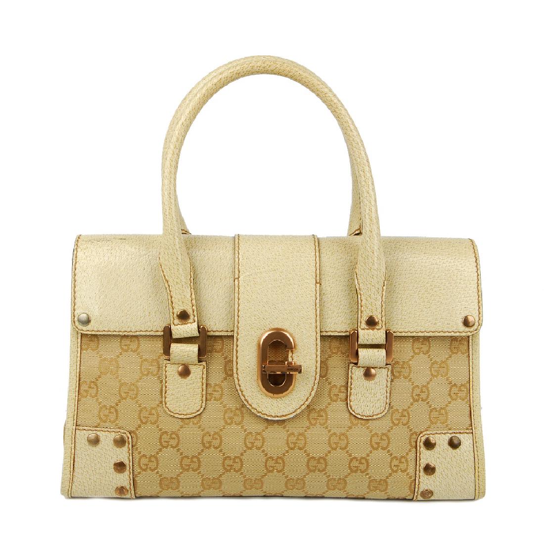 SoldGUCCI - a Bardot handbag. Designed with the maker'sGUCCI - a Bardot handbag. Designed with the maker's signature monogram canvas exterior and textured tan leather trim, gold-tone hardware, dual rolled leather top handles, a piston-lock front fasteningSee Sold Price