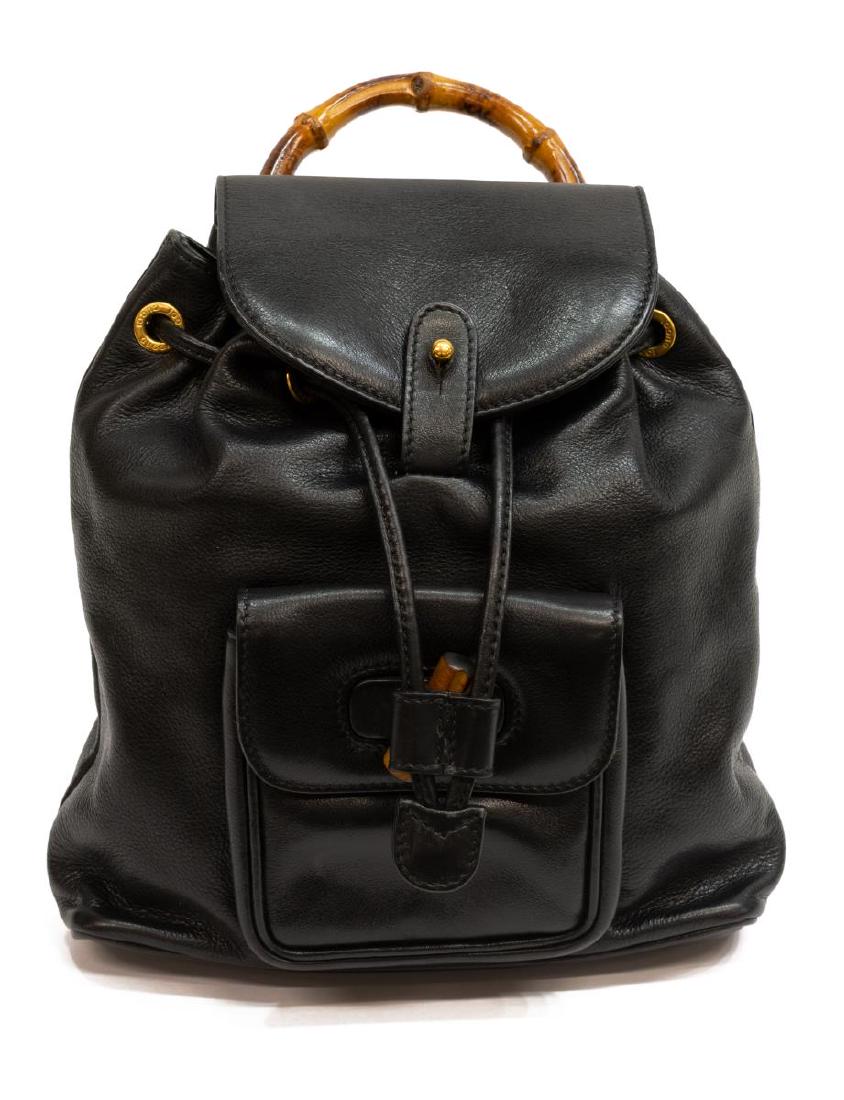 SoldGUCCI BLACK LEATHER & BAMBOO MINI BACKPACKGucci mini backpack in black leather, with gold-tone hardware, dual adjustable shoulder straps, rounded bamboo top handle, exterior pocket at front with bamboo turn-lock closure, tonal Diamante canvasSee Sold Price