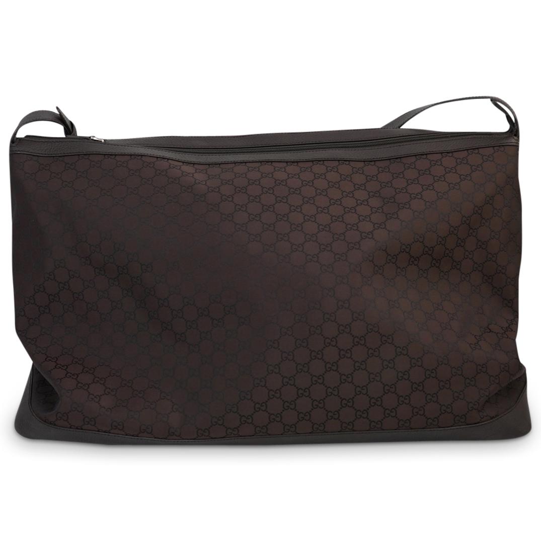 SoldVintage Gucci Monogram Luggage BagVintage Gucci brown monogram luggage bag or soft side travel suit with gilt hardware, wear to age. 20" H x 27" W x 6" D.See Sold Price