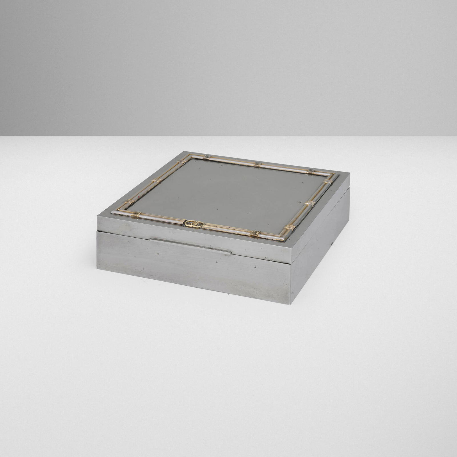 SoldSILVERPLATE. Gucci Silverplate Buckle Cigar Box.Gucci Italian silverplate hinged cigar box with applied buckles and wood interior. Stamped, "Italy Gucci". From a Manhattan, NY estate. Dimensions: cigar box measures approx. 7.875" w xSee Sold Price