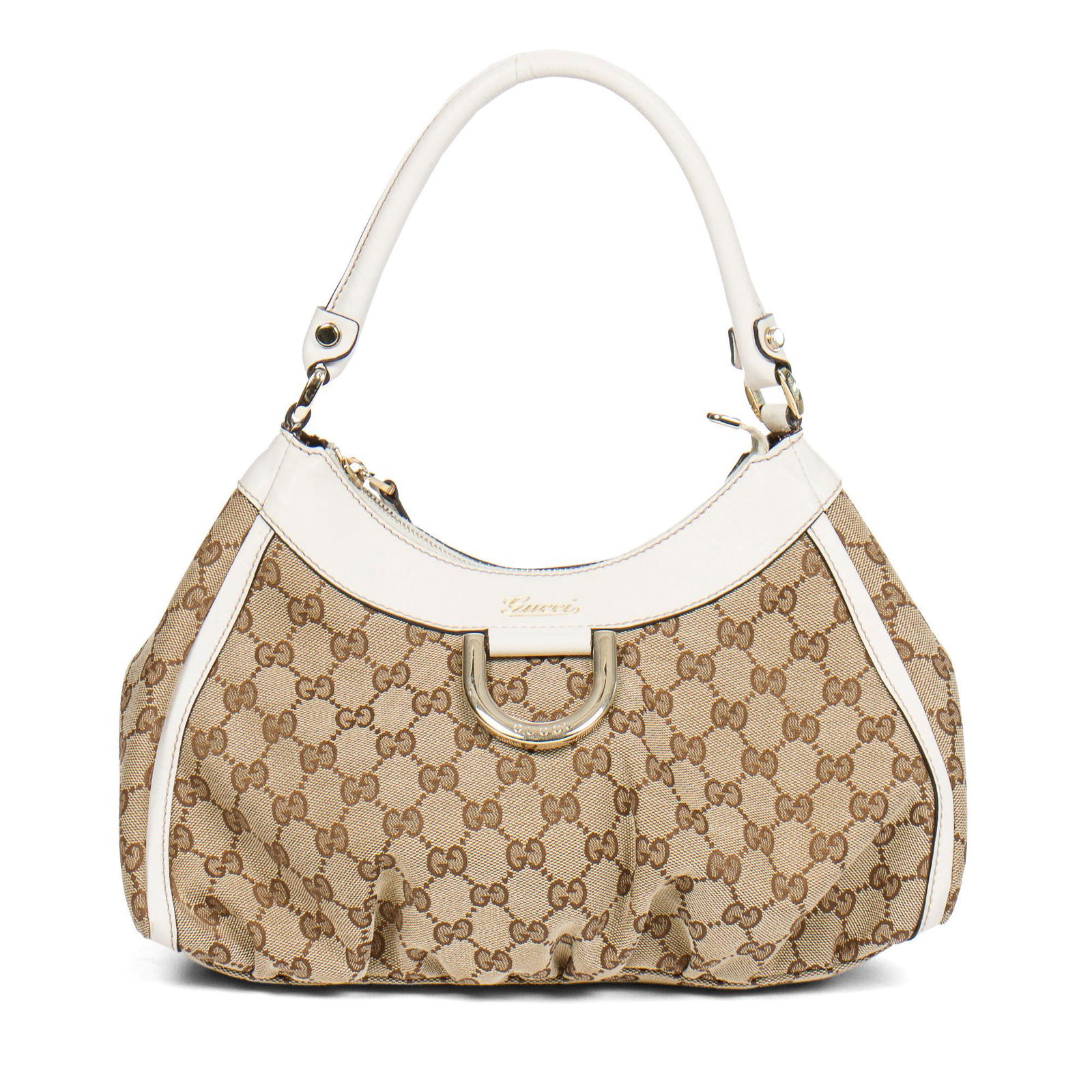 SoldGUCCI MONOGRAM CANVAS D-RING HOBO BAGShoulder BagGucciD-Ring Hobo-Beige/Brown Monogrammed Canvas-White Leather-Champagne Gold Hardware-30cm x 20cm x12cm-AAP7852See Sold Price
