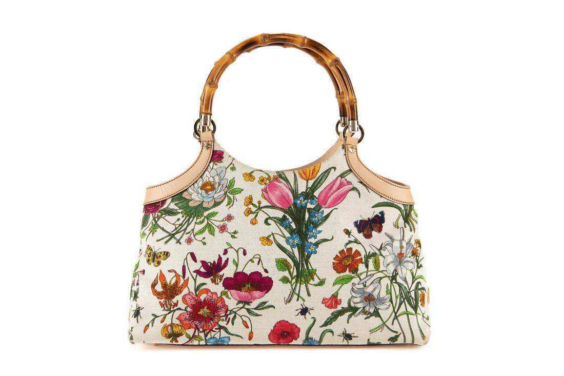 SoldGucci Vintage Bamboo Handle Flora Canvas Tote BagGucci structured floral canvas handbag tote featuring the iconic multicolor Flora print with flowers, insects, and butterflies, trimmed in natural Vachetta leather with polished bamboo handles. IncludSee Sold Price