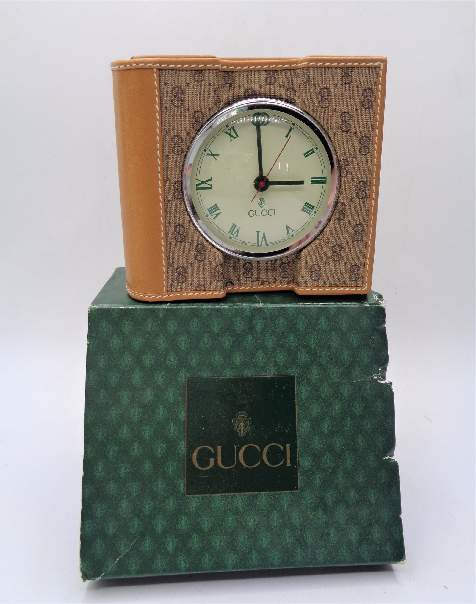 SoldGucci Clock & Paper PadGucci clock with logo pattern. Opening in top for pens/pencils ect. Brown leather trim with white stitching. Needs battery. Item is 6.5" inches wide and 3.5" inch tall. Comes inside original box. ExceSee Sold Price