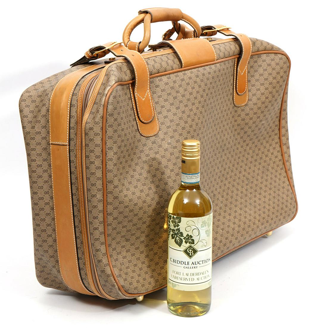 SoldGucci Monogrammed Coated Canvas Soft Case SuitcaseGucci Monogrammed Coated Canvas GG Logo Soft Case Suitcase, with gold-tone lock and hardware, brown leather top handle, the zipper opening to cotton lining and brown leather straps, marked "Made in ItSee Sold Price