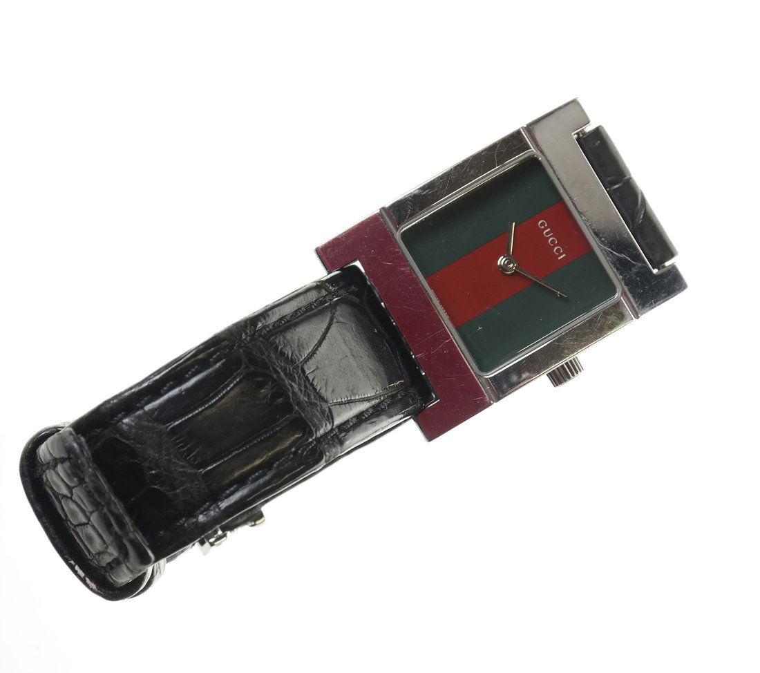 SoldAUTHENTIC GUCCI STAINLESS STEEL LOGO CLIP WATCH 9100L 3ATM DATE 24MM WRISTWATCHAuthentic Gucci Stainless Steel Logo Clip Watch 9100L 3ATM Date 24mm Wristwatch 24mm Case 16mm Lug MPN: 9100 L Serial: 0001See Sold Price