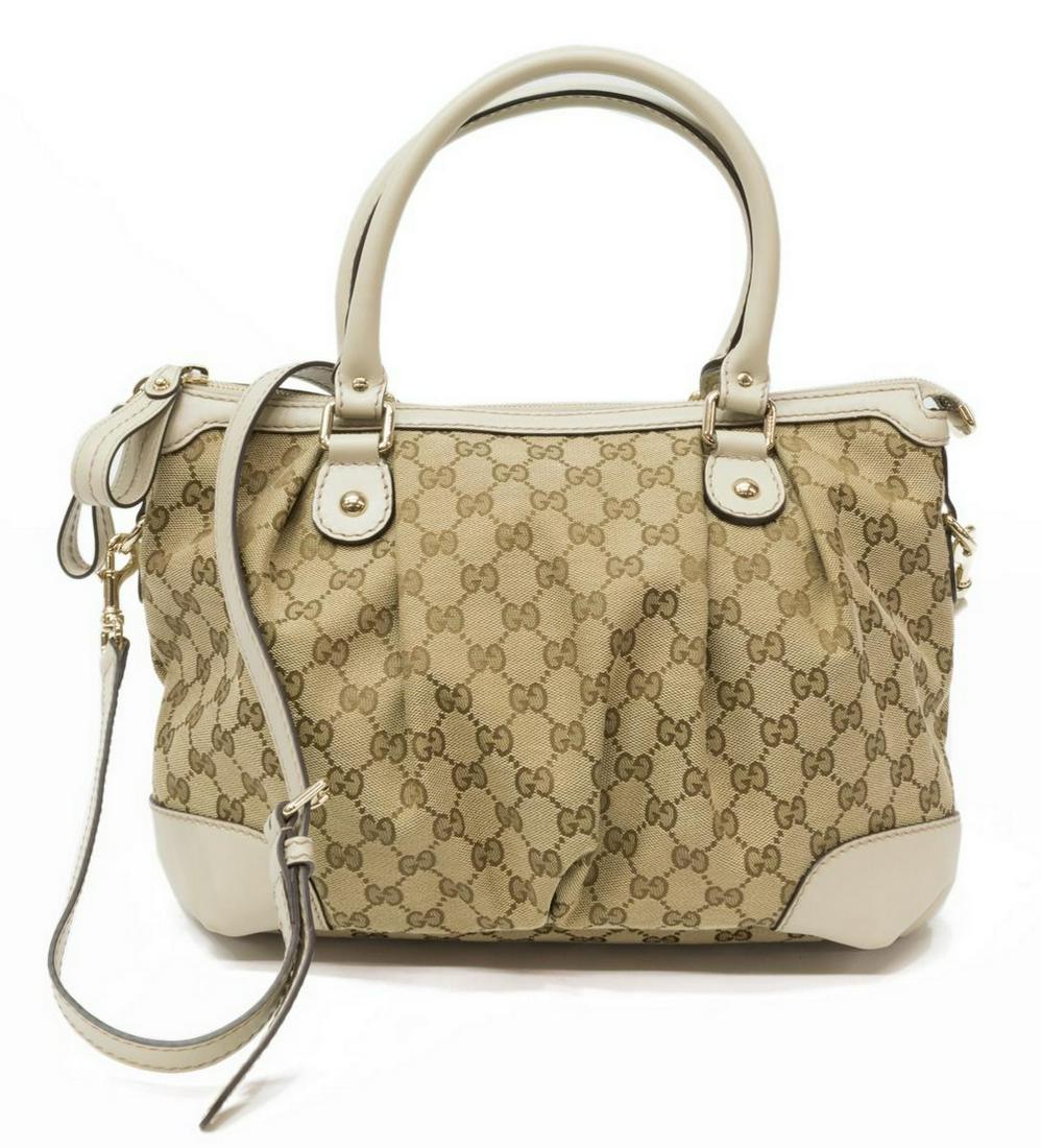 SoldGucci Monogram Coated Canvas & Leather ToteGucci Monogram Coated Canvas & Leather Purse / Handbag. Gucci logo monogram coated canvas purse with leather handles and trim. Measures 8.5 inches x 14 inches.See Sold Price