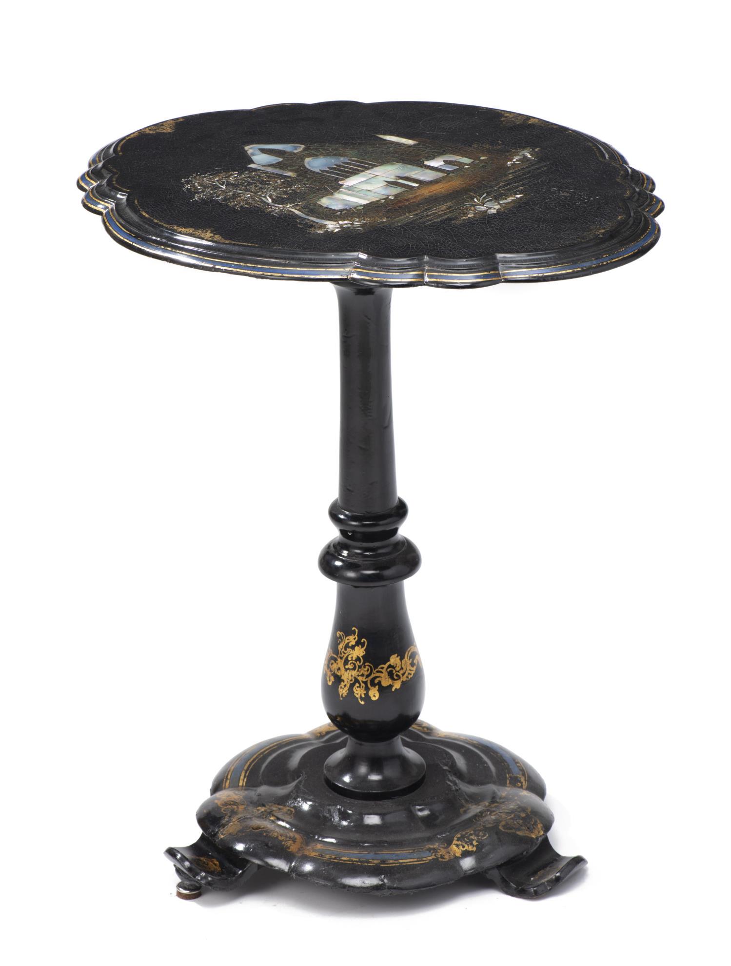 Table d'appoint, fin du XIXe s., en bois naturel et bronze doré, plateau ovale en marbre, piedsServiteur muet, Angleterre, XIXe s., en placage de loupe de bouleau de Carélie, plateau ceint dTable d'appoint d'époque Napoléon III, en bois noirci et incrustations de laiton, nacre etGuéridon par la maison Colombostile, Italie, XXIe s., en métal doré, à montants