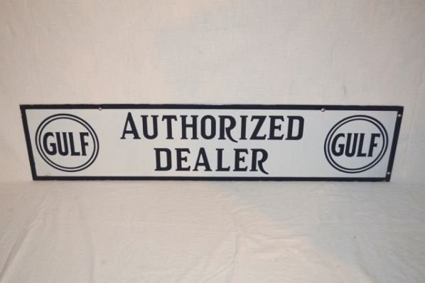 SoldGulf Authorized Dealer Porcelain SignGulf Authorized Dealer Porcelain Sign. Has been touched up. This item requires third-party shipping or pickup arrangements to be made. Dimensions: 9 x 39See Sold Price