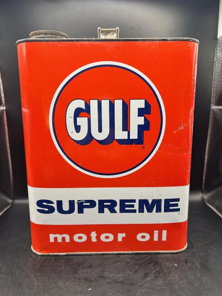 Rare Gulf Oil Milk Glass Tin SignDST milk glass on original can. Good gloss and color. Shows areas of paint loss in the field on one side. It also shows paint loss along the perimeter. The lower "Supreme Auto Oil" glass lenses are neSee Sold Price