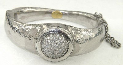 SoldCathy Waterman 22k Gold Platinum Diamond BangleMETAL: 22k gold/ platinum. MEASUREMENTS: bracelet will fit up to 6 3/4" wrist and is 6.5mm wide. GEMSTONES: diamonds approx. 1.20ctw. MARKED: CW marks, 22k, plat. WEIGHT: 29.5 grams.Gemstones havSee Sold Price