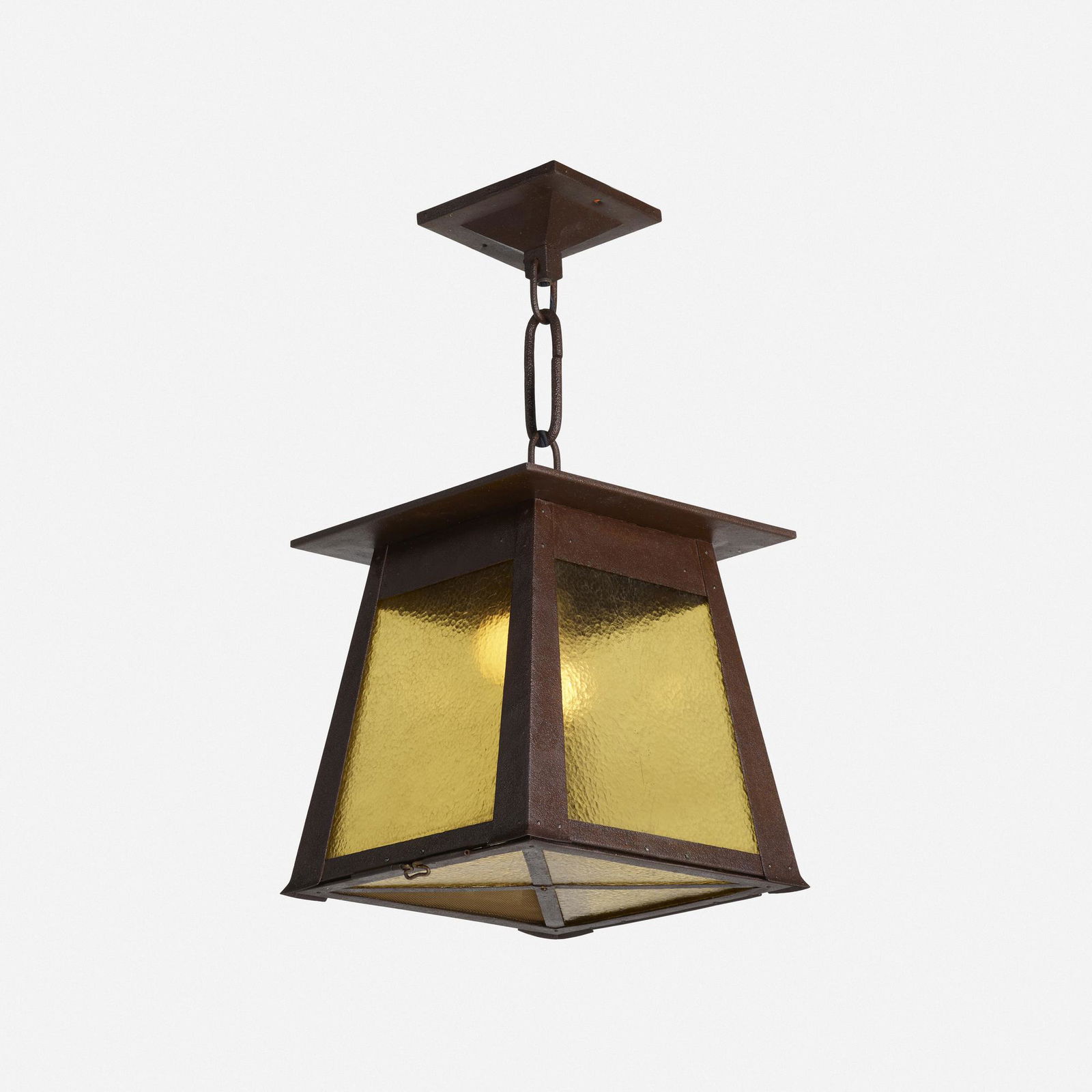 SoldGustav Stickley (1858-1942) hanging lanternGustav Stickley (1858-1942) hanging lantern Eastwood, New York iron, hammered amber glass unsigned 6.5"w x 7"d x 17"h, overall 57"h Literature: The lamp appears in the June 1903 issue of The CraftsmanSee Sold Price