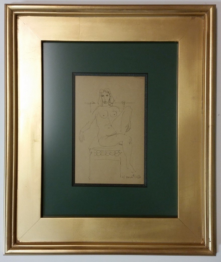 SoldH Matisse Signed Watercolor Pen and InkH. Matisse signed, two women in the garden, watercolor/pen and ink, 1946-47, 13 1/2" x 9", frame 29 1/4" x 26". Provenance: From a Palm Beach estate. Provenance: From a Palm Beach collection.See Sold Price