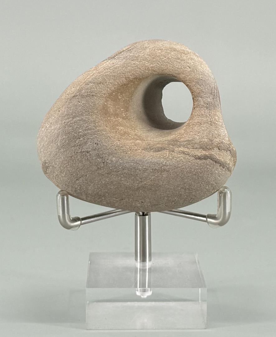 SoldHag Stone3 3/4" by 3 1/4" by 2 1/8". 378 grams. Provenance: From the estate of Moosehead Gallery rock shop in Hamilton, Montana. A "hag stone" is a rock with a natural hole in it.See Sold Price