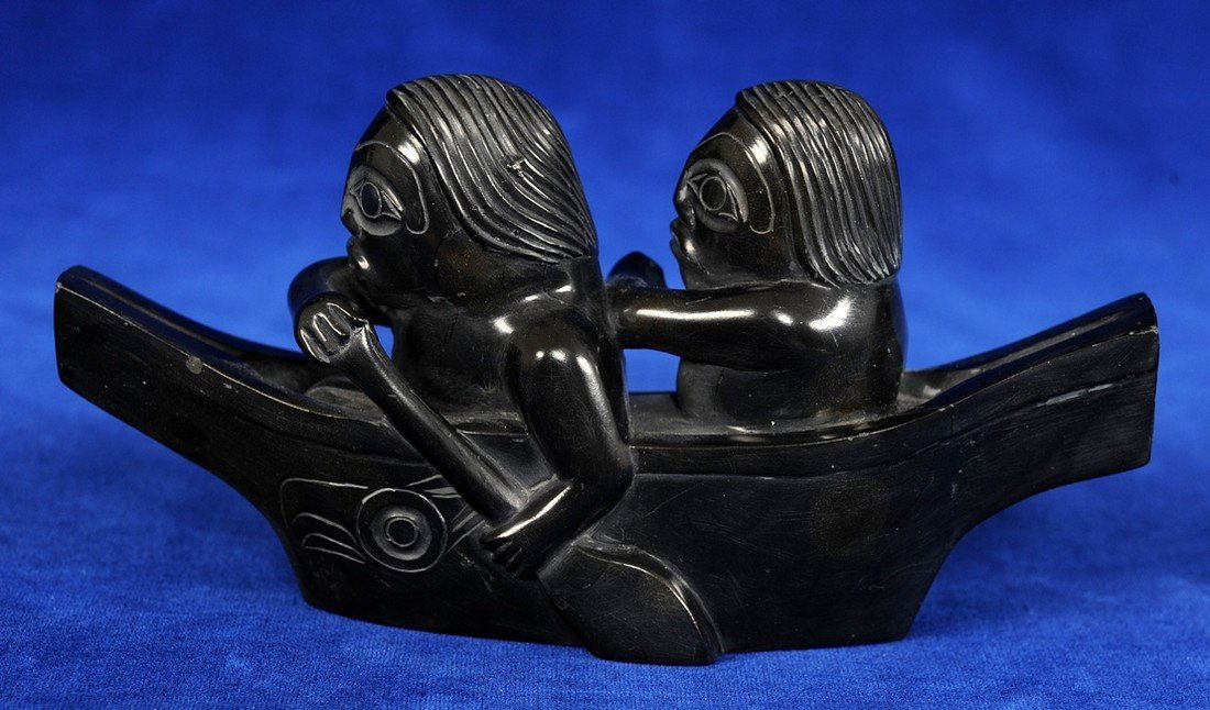 Sold20th C. Haida Carved Argillite Totem Figure - 2 BearsNorth America, Pacific Northwest, probably Haida people, ca. 20th century CE. A black argillite totem carved with two bears and on a flat base. Argillite is a fine grained sedimentary rock that is essSee Sold Price