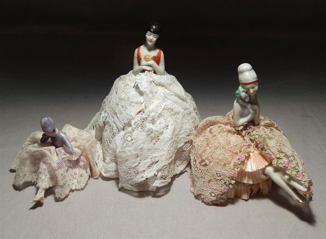 SoldGerman Porcelain Half Doll Pin Cushion HoldersThree porcelain half dolls featuring hand-painted details. Each figure has distinct characteristics, including styled hair and accessories like a fan. Drilled holes at the bottom of bases for attachmeSee Sold Price