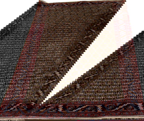 SoldPersian Wool Carpet, Bijar, 7'9" x 4'5"Persian Wool Carpet, Bijar, wool warp and weft, the field with an allover boteh design on navy blue, with multiple floral scroll and geometric borders. Dimensions: 7'9 x 4'5 Condition: Low areSee Sold Price
