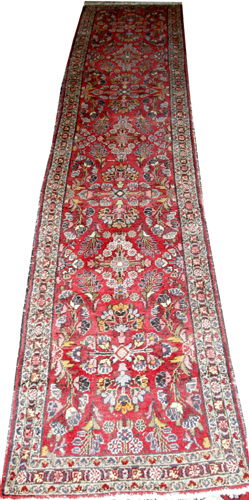 SoldHAMADAN ORIENTAL RUNNER W 2'7" L 9'8"HAMADAN ORIENTAL RUNNER W 2'7" L 9'8" 2'7" x 9'8" . Hand woven All wool. Red field.See Sold Price