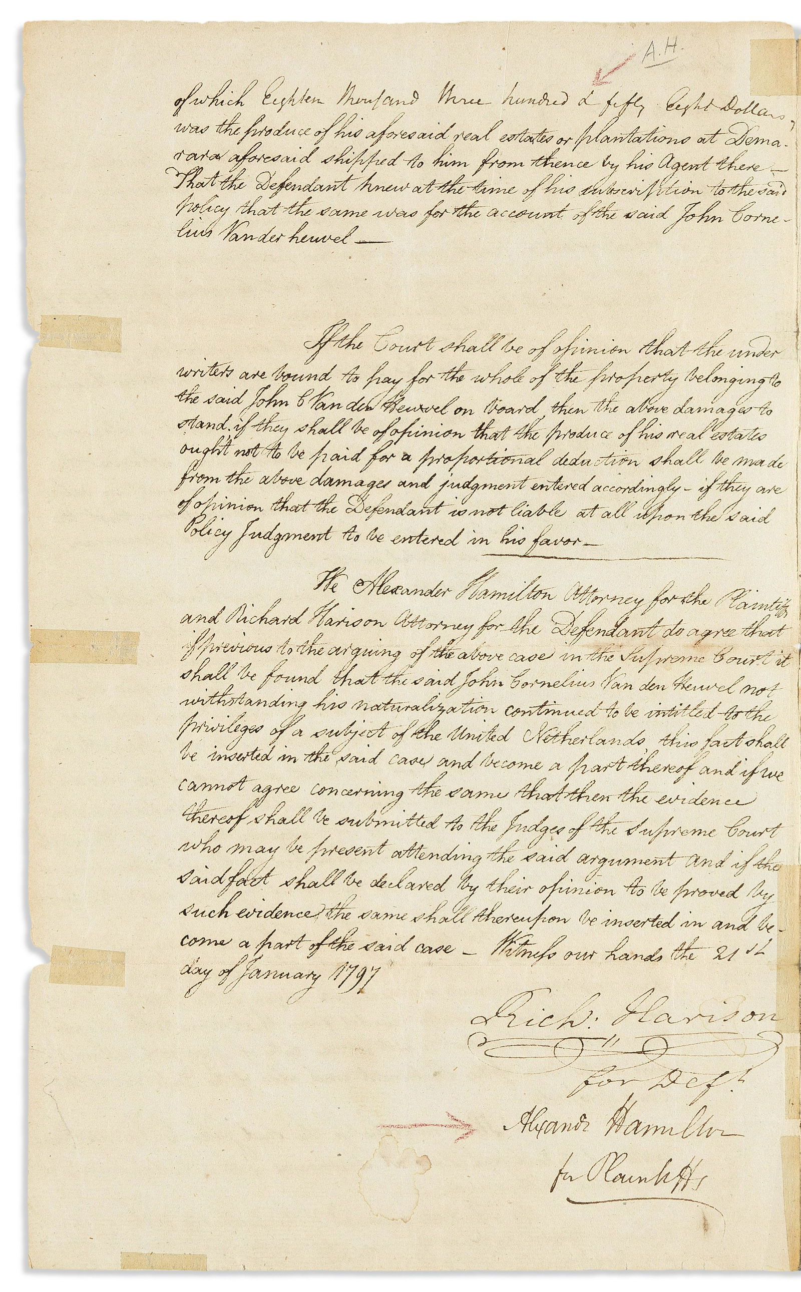 HAMILTON, ALEXANDER. Document Signed, "Alexandr Hamilton / for Plaintiffs," with three additional