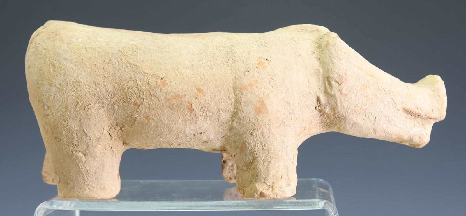 SoldHan Dynasty Pottery PigTerracotta figure of a pig dating to the Han Dynasty (206 BC-220 AD). Pig measures 4.5" x 5" x 10" in length. Figure exhibits crack at leg. Provenance: From the estate of an important Boston collectorSee Sold Price