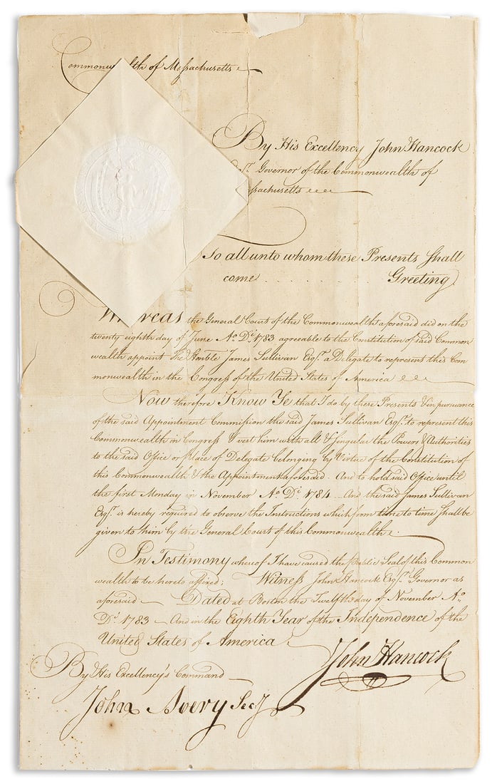 HANCOCK, JOHN. Document Signed, as Governor, appointing James Sullivan Massachusetts delegate to