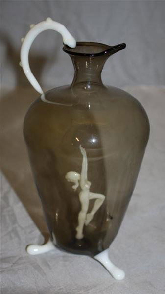 SoldUNSIGNED LOETZ PITCHER W/ METAL TOP12 1/2" TALL--HAND BLOWN PITCHER WITH ENAMEL SILVERPLATE TOP--APPLIED HANDLE--SOME ENAMEL WEAR.See Sold Price