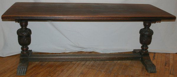 HAND-CARVED OAK TRESTLE STYLE LIBRARY TABLE,