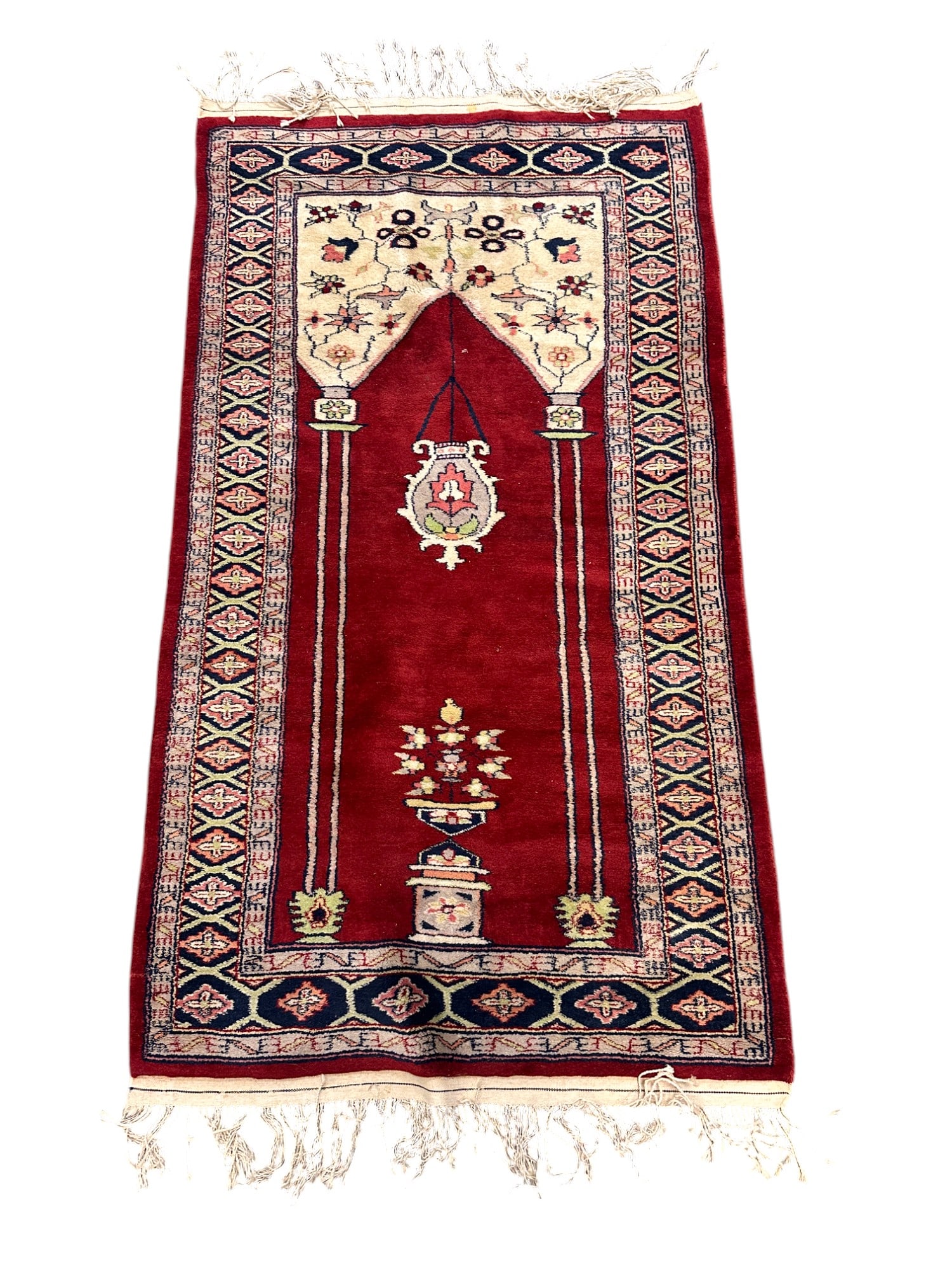 SoldHAND KNOTTED WOOL PRAYER RUGVintage Hand Knotted Wool Prayer Rug. Measures 50 1/2" x 39"See Sold Price
