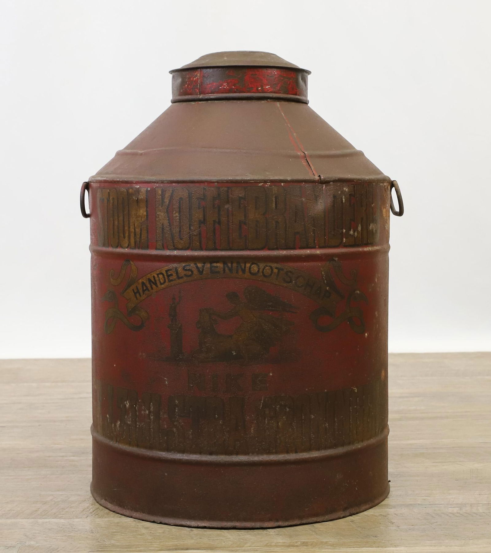 SoldAntique Red Tin Hand Painted Stencil Decoration Store ContainerAntique red tin store container hand painted and stenciled.See Sold Price