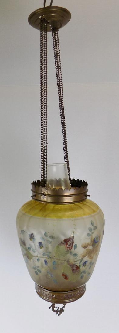 SoldVICTORIAN HANGING LIGHT FIXTURE W/ HAND PAINTED SHADEVICTORIAN HANGING LIGHT FIXTURE W/ HAND PAINTED SHADE - ORIGINALLY OIL - HAS BEEN ELECTRIFIED - BRASS FONT, HANGING BRACKETS, CHAIN, ETC.See Sold Price