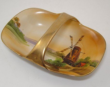 SoldHand Painted Nippon BasketGreen M in Wreath mark. Hand Painted Nippon. Handled with hand painted floral decorations. 4 1/4"L. 2"H.See Sold Price