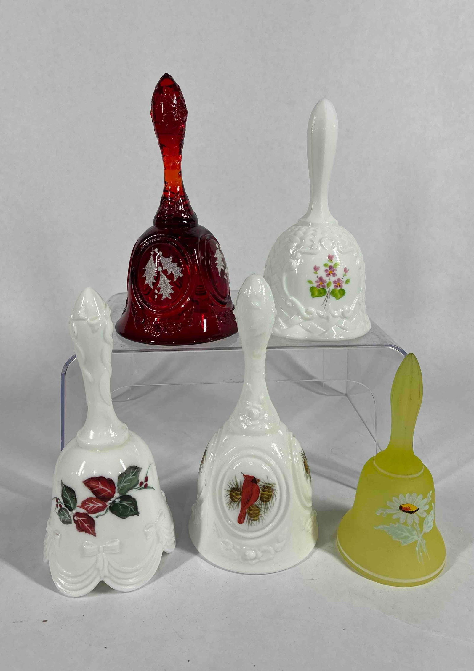 Hand Painted Signed Satin, Ruby and Milk Glass Bells