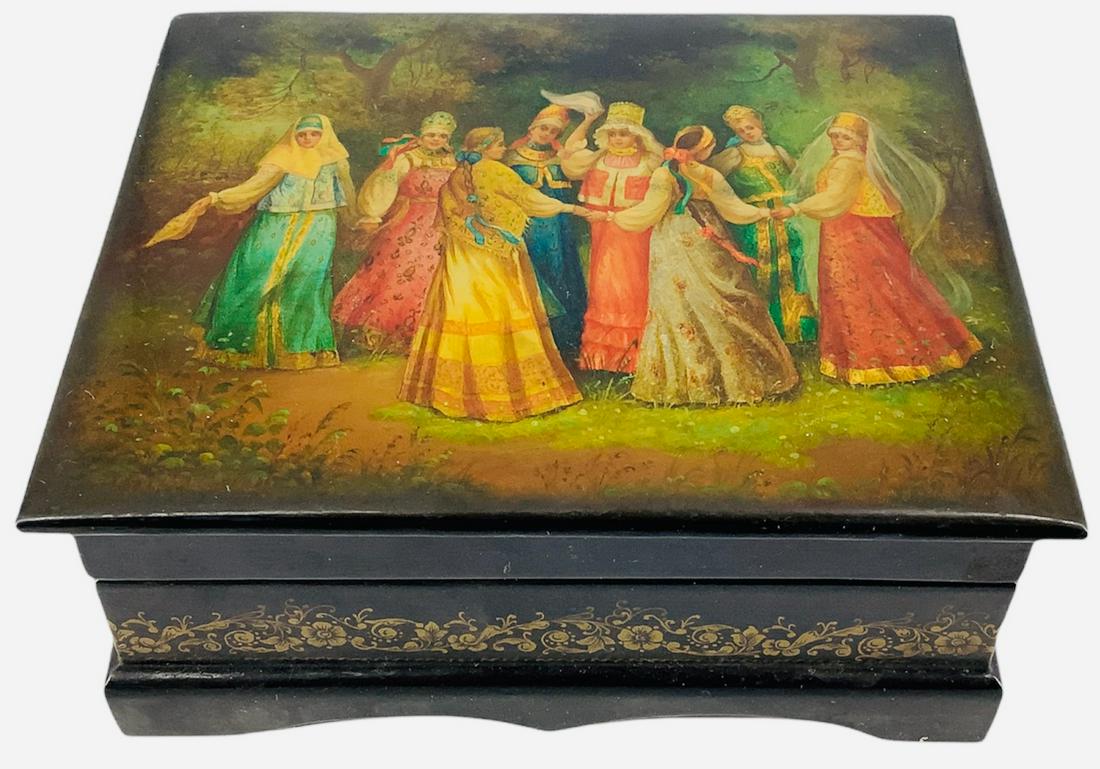 SoldSIGNED RUSSIAN BLACK LACQUER HAND PAINTED TRINKET BOX WINTER SCENESIGNED RUSSIAN BLACK LACQUER HAND PAINTED TRINKET BOX WINTER SCENE——MEASURES APPROXIMATELY —5"X4"X2"——All items Located in Hollywood Florida Warehouse. Thank you for yourSee Sold Price