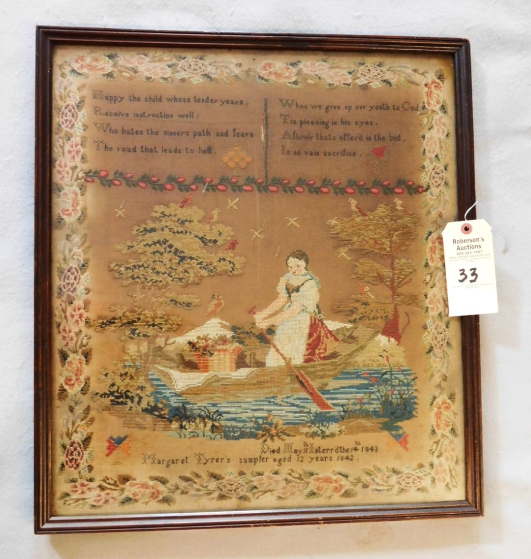 AMERICAN SCHOOL "ROLLING STONE FARM 1931" NEEDLEWORK TAPESTRY, DATED 1936.3 days LeftFINE AND RARE SUSAN TILTON (DANVILLE, VERMONT, B. 1813) NEEDLEWORK SAMPLER, DATED 1827. Frame, 17"h.3 days LeftAMERICAN FOLKSY NEEDLEWORK FARMYARD SCENE.3 days LeftAntique alphabet/numeric sampler w birds & flowers "Lydia Ann Wright" - overall framed size 26"x266 days LeftEarly 19thC sampler w Adam & Eve, birds, cat, lion, stag, tree, fruit, etc dated 1803 - overall6 days LeftAntique pictoral sampler w initials, verse, house, flowers, etc - overall framed size 25"x32"6 days LeftSALLY OSGOOD (ANDOVER, MASSACHUSETTS) NEEDLEWORK SAMPLER, DATED 1808. Frame, 20.5"h. 19.5"w.3 days LeftEarly pictoral sampler "Sikee Pharo 1732 Her Sampler" - overall framed size 22 3/4" x 9 1/2"7 days LeftMERIBAH ELLIS (AMERICAN) FAMILY RECORD PETIT POINT SAMPLER.3 days LeftMARGARET SWAIN (MASSACHUSETTS) NEEDLEWORK MOURNING MEMORIAL SAMPLER FOR THOMAS A. SWAIN, DATED 1810.3 days LeftTHREE AMERICAN PATRIOTIC BERLIN SAMPLERS. Largest, 14"h. 26.5"w.3 days LeftMARTHA LOMAS (AMERICAN) NEEDLEWORK SAMPLER, DATED 1853. Frame, 28.75"h. 28"w.3 days LeftSARAH SHAW (ENGLISH, B. 1837) ADAM AND EVE NEEDLEWORK SAMPLER, DATED 1848.3 days LeftEarly 19thC alphabet, verse & pictoral sampler from Scituate, MA by "Isabella Litchfield born7 days LeftELIZA ELDERD (AMERICAN) NEEDLEWORK SAMPLER, DATED 1806.3 days LeftEarly 19thC sampler from Scituate (MA) by Jan Olie(?) born 1794 done in 1804 at 10 years old -7 days Left