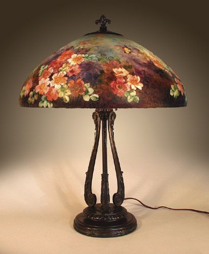 SoldHandel Reverse Painted Lamp, The Handel CompanyHandel Reverse Painted Lamp, The Handel Company, Meriden, Connecticut, Early Twentieth Century. The shade design 6688, reverse painted with butterflies hovering amidst flowers in shades of pink, red aSee Sold Price