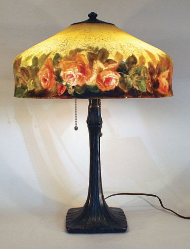 SoldAntique Pairpoint Style Reverse Painted Shade LampAntique Pairpoint Style Reverse Hand Painted Puffy Lamp Shade Featuring Rose Motif in Relief and Bronze Tone Metal Base Featuring Sunflowers in Relief. The shade is not signed. Shade measures 8 inchesSee Sold Price