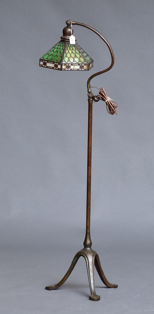 SoldHandel Bronze Bridge Floor Lamp, Slag ShadeThe Handel Lamp Company patinated bronze bridge floor lamp, Meriden, Connecticut, early 20th century, the caramel and green leaded glass shade supported by an adjustable tripod lamp base with spade feSee Sold Price