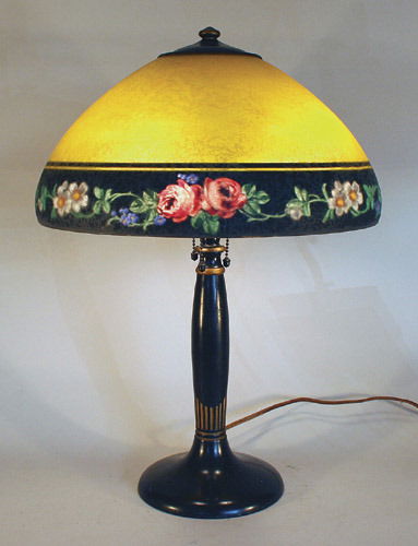 SoldHandel Table Lamp With Reverse Painted Shade.A "chipped ice" shade with a floral decorated border. Nice original lamp with a good large shade. Signed. Shade Patent Number: 979664. From a Clifton, New Jersey estate. - Dimensions: 22" h x 18" dia.See Sold Price