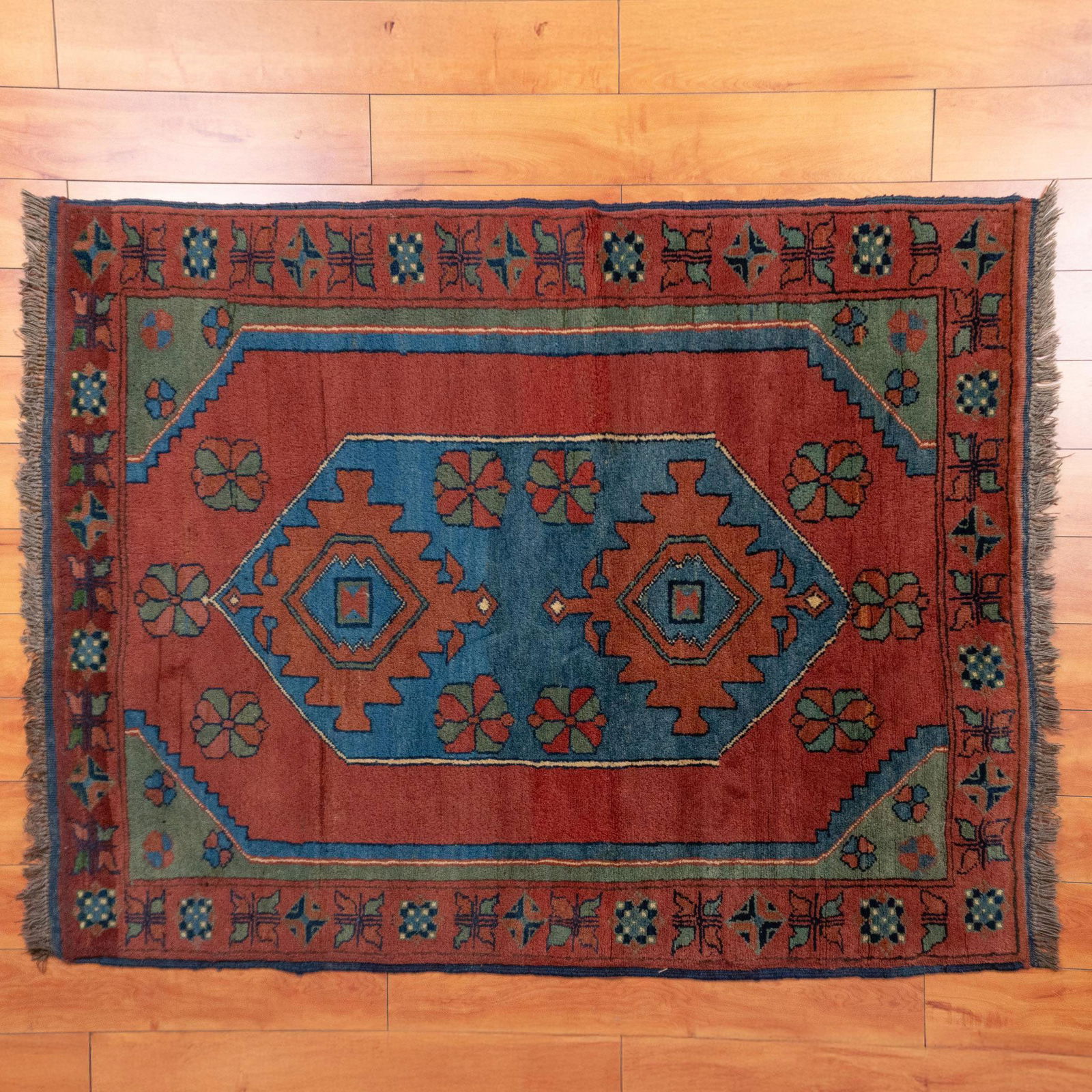 SoldVintage Handmade Persian RugVintage Handmade Persian style rug. Floral and foliage motif. Deep blue, red, and neutral hues throughout. Fringe edges. Some losses to fringe and some surface wear consistent with age and use. MeasurSee Sold Price