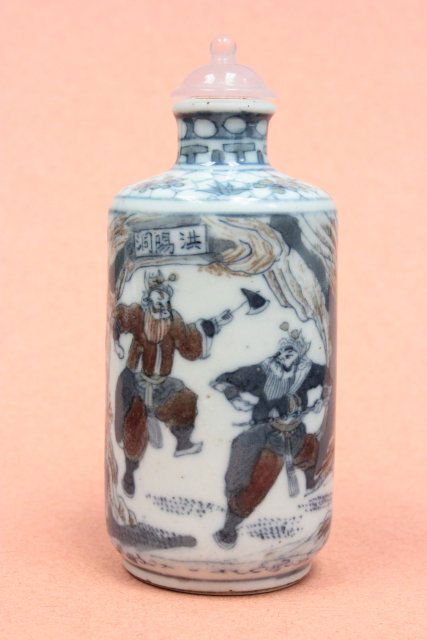 SoldCHINESE HAND PAINTED PORCELAIN SNUFF BOTTLEPorcelain with hand painted Zhong Kui. Approx. 3 1/4". 8.2cm. Single owner collection from a Manhattan estate.See Sold Price