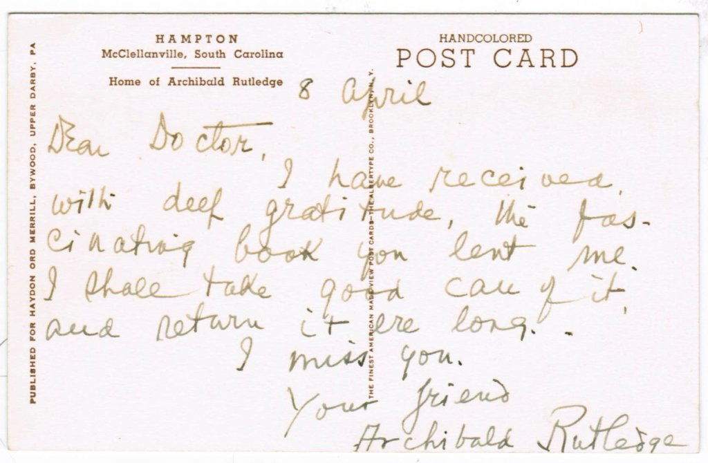 Handwritten Postcard from Archibald Rutledge