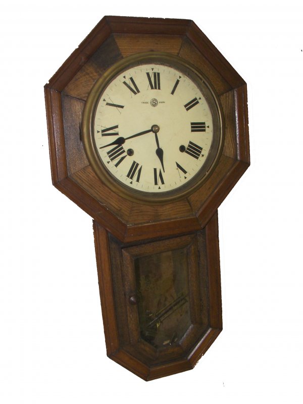 Hanging oak regulator clock with etched bird