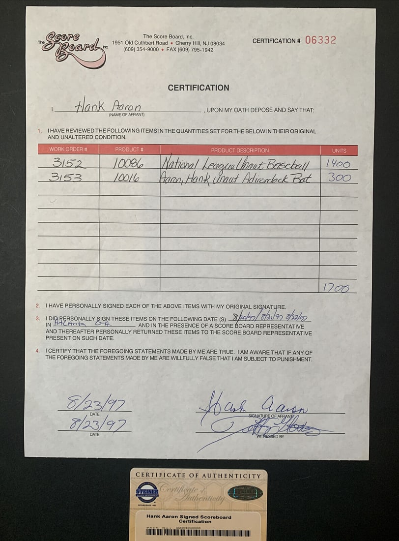 hank aaron signed baseball contract score