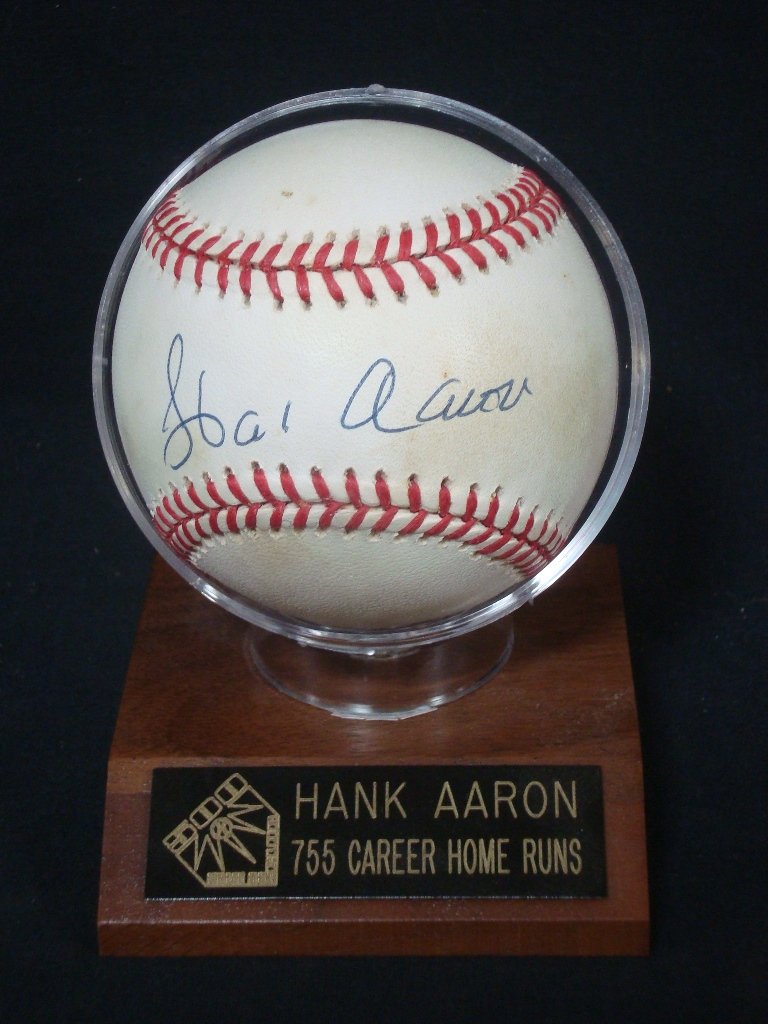 SoldHANK AARON SIGNED BASEBALLHank Aaron was a legendary American baseball player, best known for breaking Babe Ruth’s record for most career home runs. Over his 23-season career in Major League Baseball, Aaron hit 755 home runsSee Sold Price