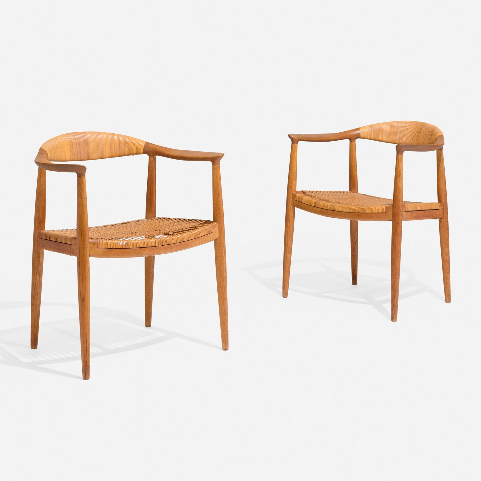 SoldHans J. Wegner (1914-2007) for Johannes Hansen TheHans J. Wegner (1914-2007) for Johannes Hansen, The Chair, pair, Denmark, 1960s, teak, caning, each with Johannes Hansen label, 25"w x 20"d x 30"hSee Sold Price