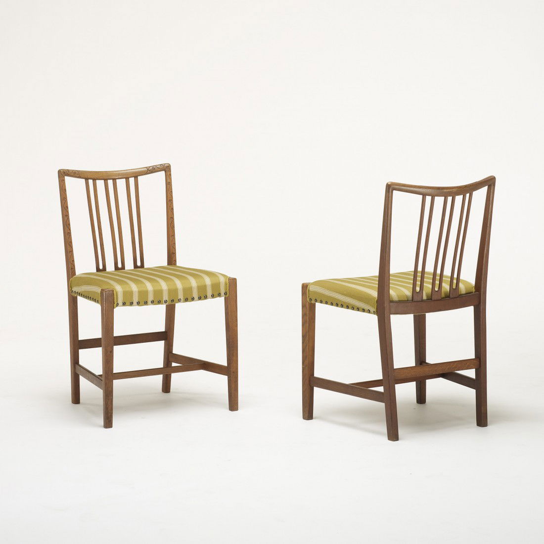 SoldHans J. Wegner, Chairs, pairHans J. Wegner Chairs, pair Mikael LaursenDenmark, c. 1945oak, upholstery, steel 33.25 h × 20 w × 2019 d in (84 × 51 × 5128 cm) This work will ship fSee Sold Price