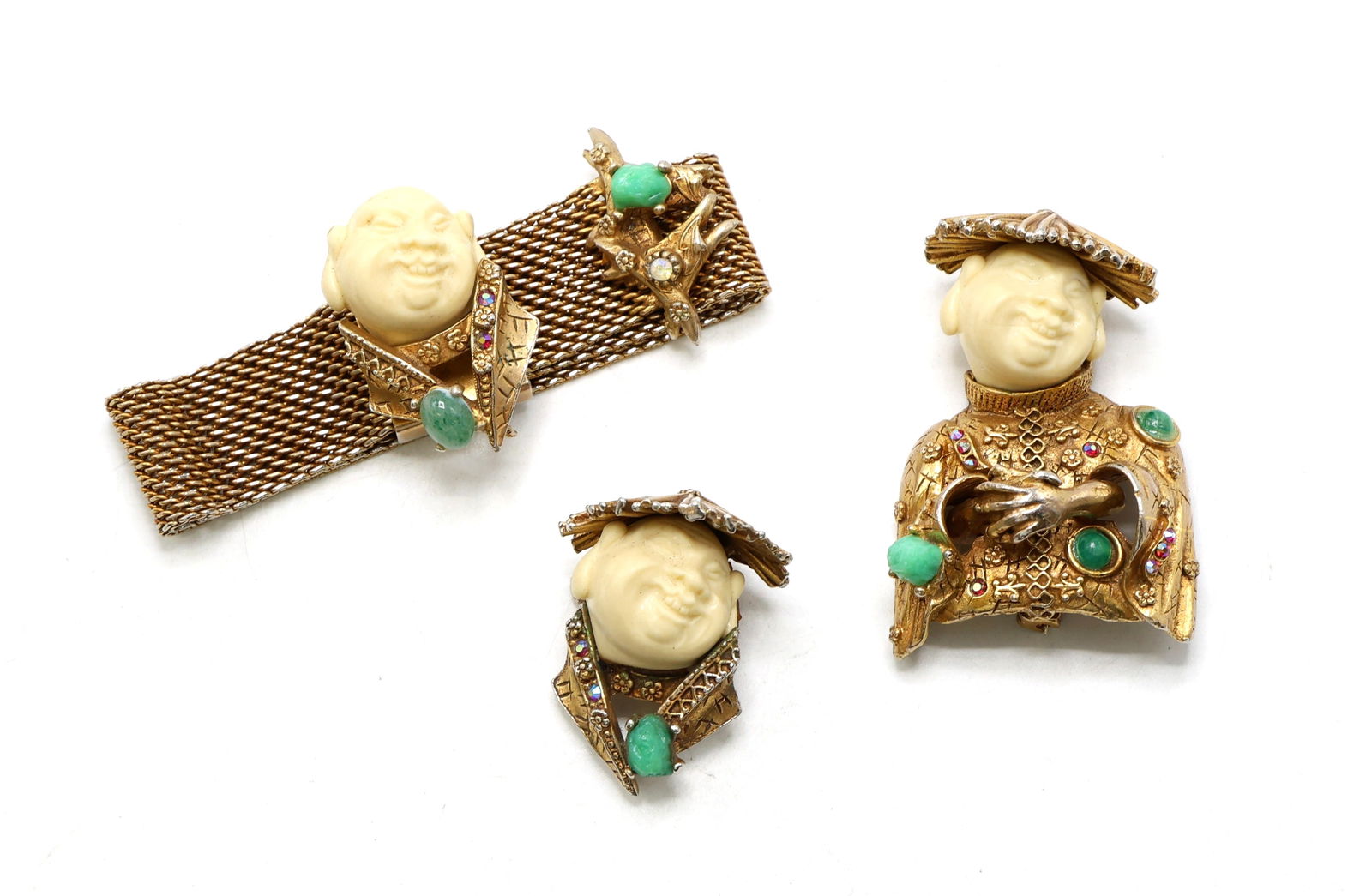HAR Figurative Jewelry Suite with Faux Jade and Rhinestones